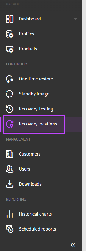 The Recovery Locations page can be found on the Management Console under the Continuity section: