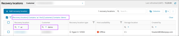 Searches can be layered, e.g. Recovery Location name contains 'Azure' and Created by contains 'team'. Once the filter is created, this will appear above the updated list similar to: [Recovery Location] Contains 'Azure' And [Created by] Contains 'team'