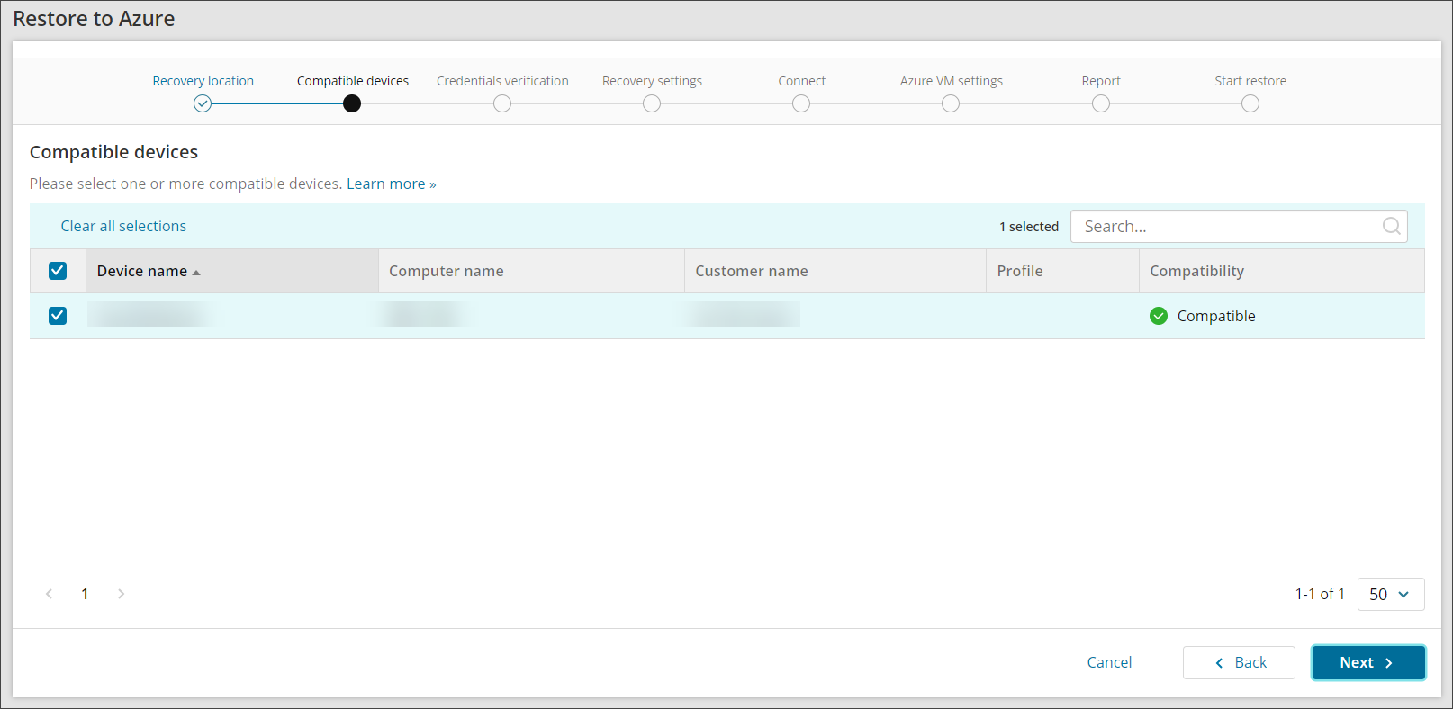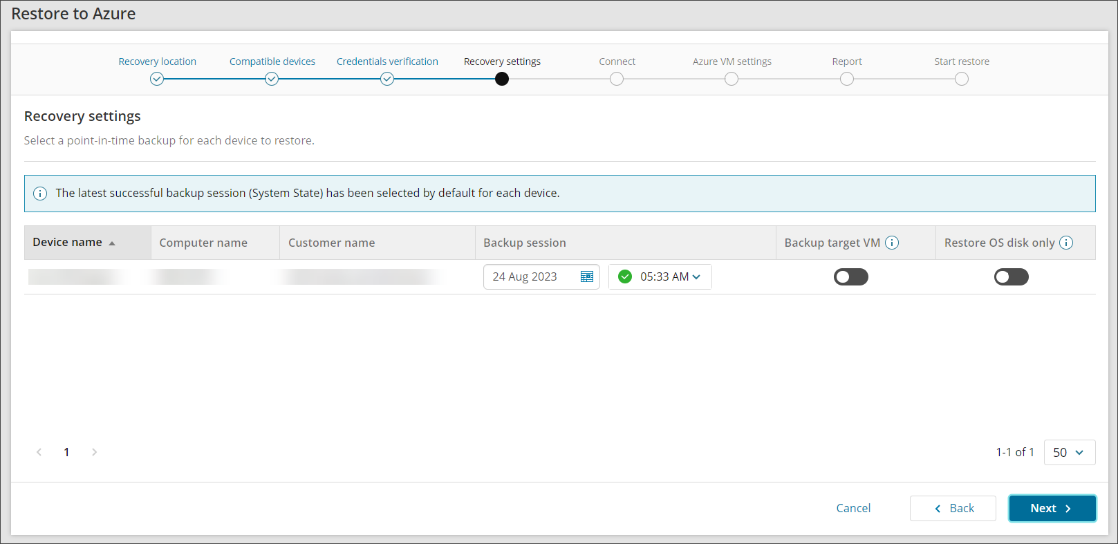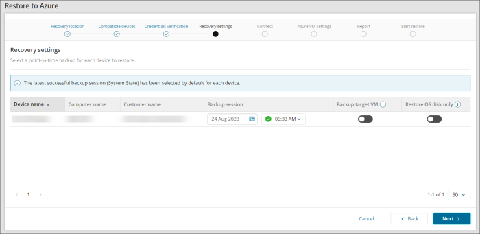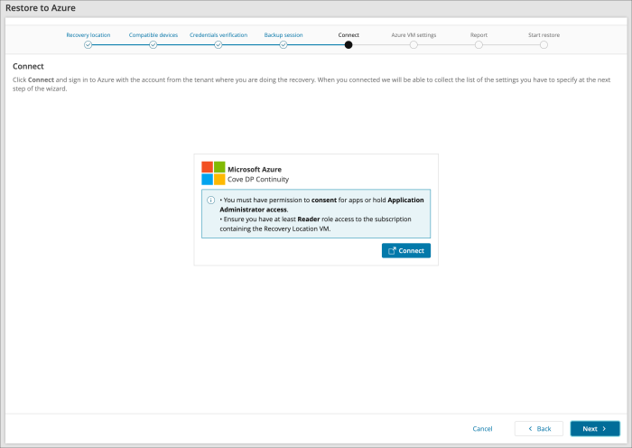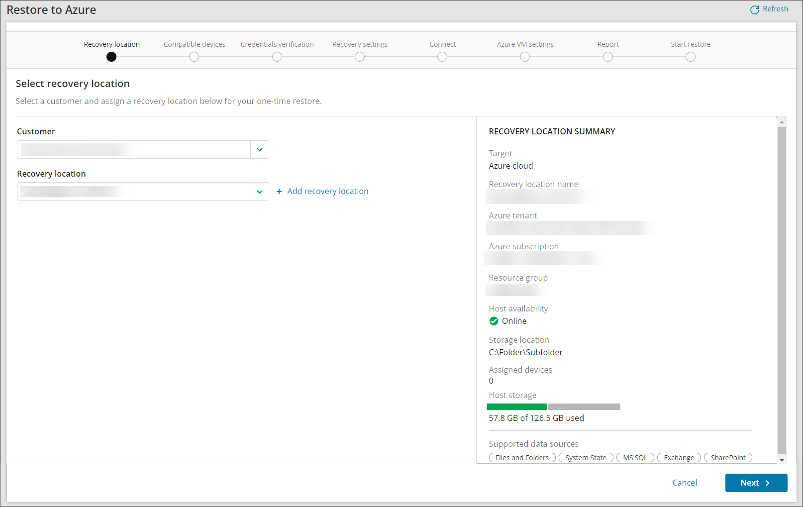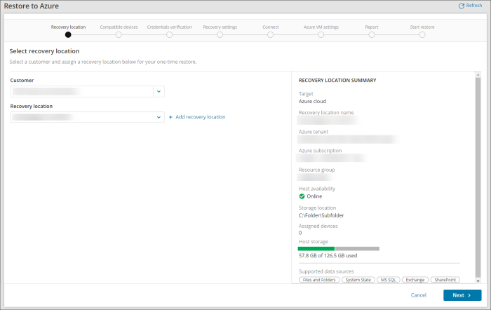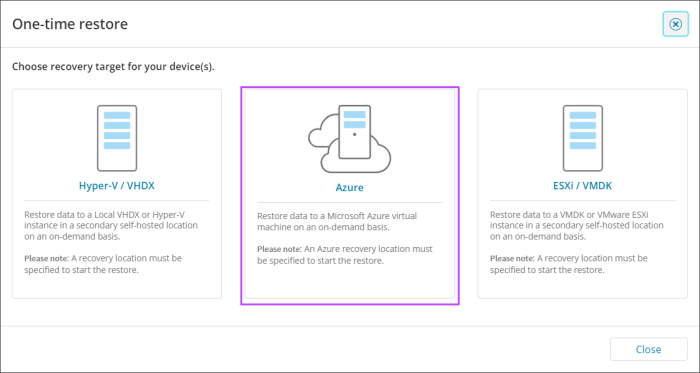 Before starting a One-Time Restore to Azure, ensure you have checked all requirements and limitations, including setting up an Azure recovery location.