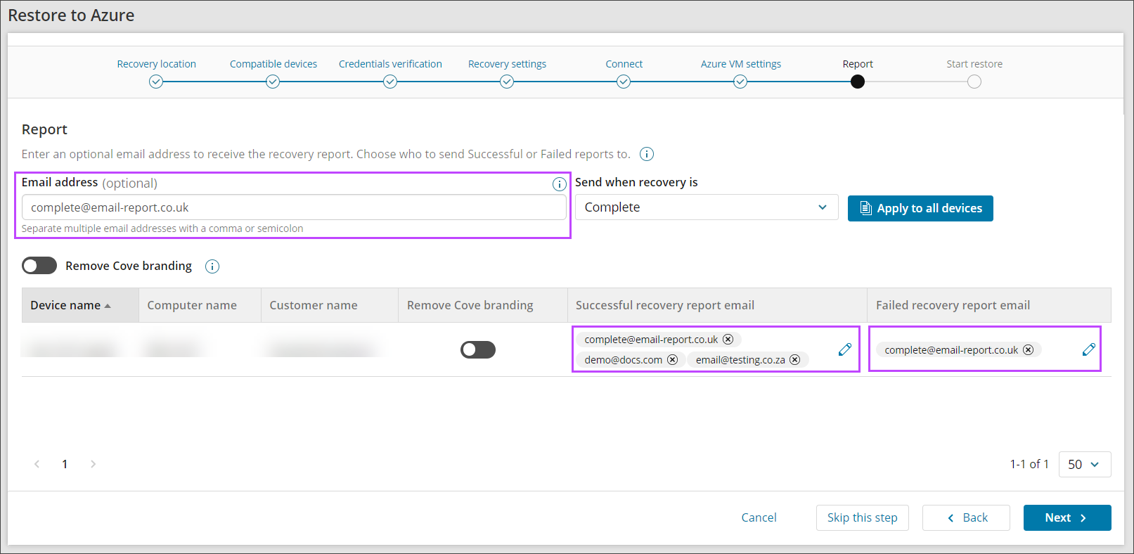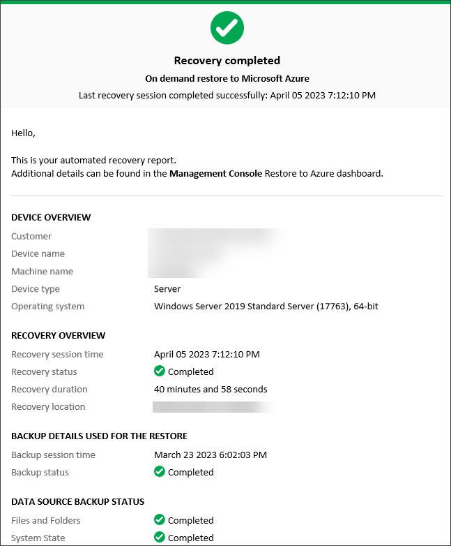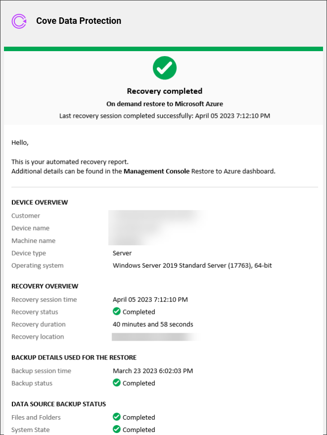 When the device(s) assigned to the plan have Successful recovery report email or Failed recovery report email recipient address(es) configured, and once the test has completed, those recipients will receive the report in their email inbox.Here is an example report with Cove branding: