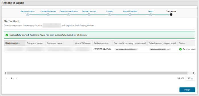- Once the restore has been started, a green banner will be displayed and a notification in the top right-hand corner of the screen to confirm. Click Finish to close the restore wizard and return to the Dashboard