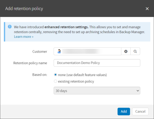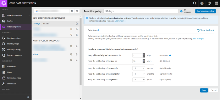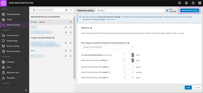 The Cove Data Protection (Cove) Retention Policies feature in the Management Console is a way of applying enhanced retention settings to your devices as an alternative to the classic Products feature used previously. This allows you to set and manage retention centrally, removing the need for Archiving schedules in the Backup Manager.