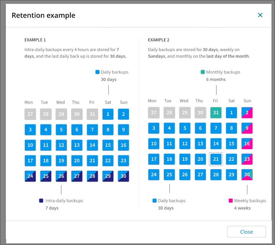 In the first example shown above, intra-daily backups are being stored for 7 days (marked by the dark blue diagonals of the last 7 days on the calendar).