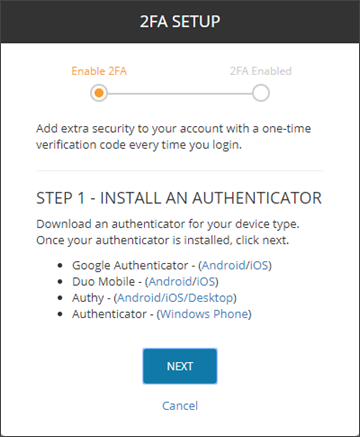 - You are now prompted to select either Continue to product or Two-Factor Setup - in either case you will be prompted to configure 2FA before being able to access Management Console