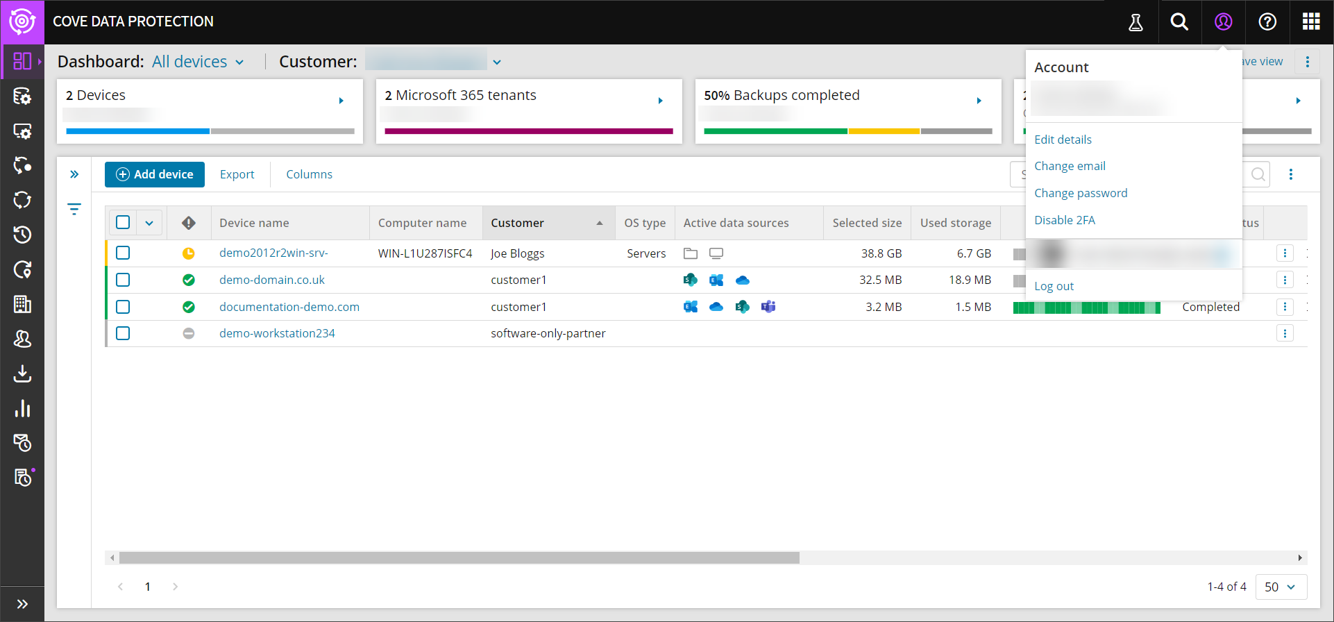 After migration the Backup Console includes further user options when clicking on the username in the upper right corner. From here the user can change their details, reset their password and enable Two-Factor Authentication.