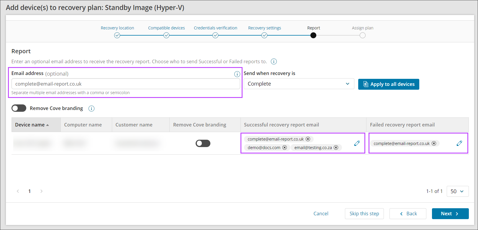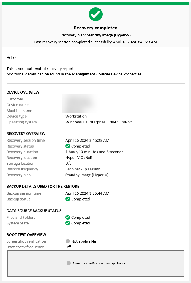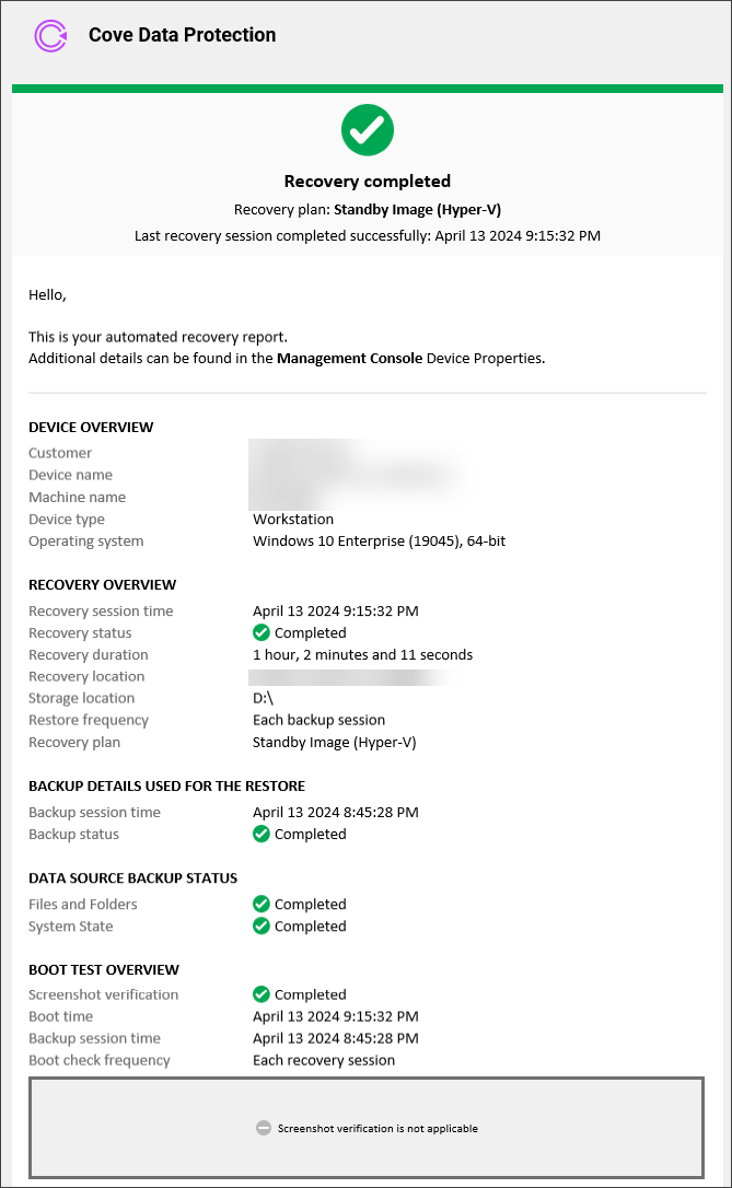 When the device(s) assigned to the plan have Successful recovery report email or Failed recovery report email recipient address(es) configured, and once the test has completed, those recipients will receive the report in their email inbox.Here is an example report with Cove branding: