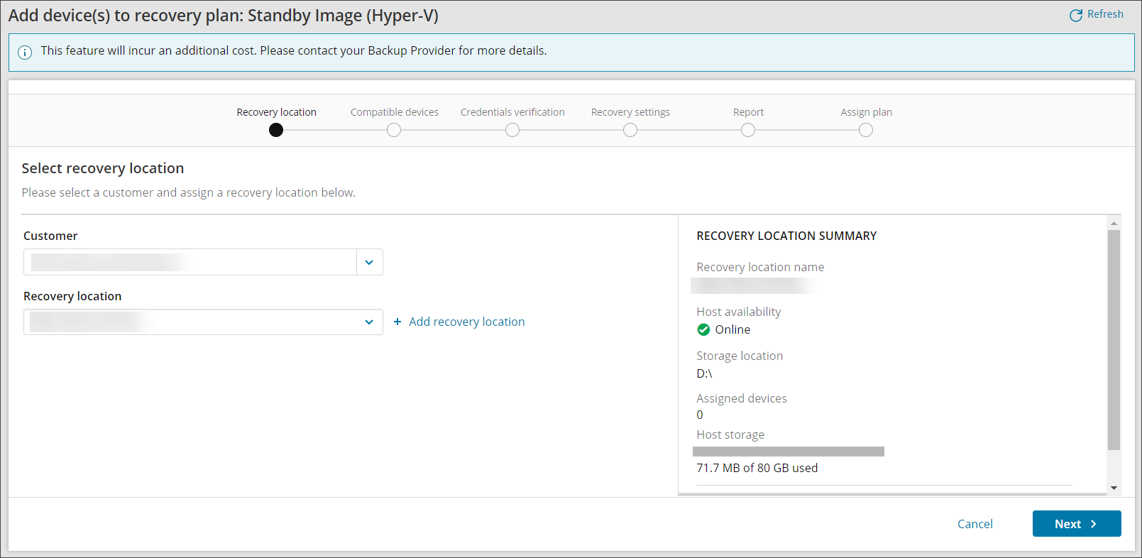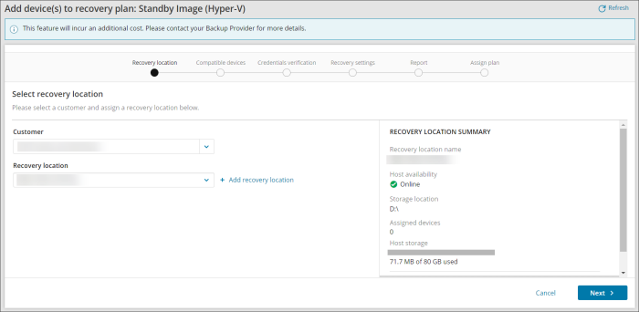 If the selected customer does not have any locations, you must add one before continuing by selecting Add recovery location. See Add Recovery Locations for full details of adding a location.