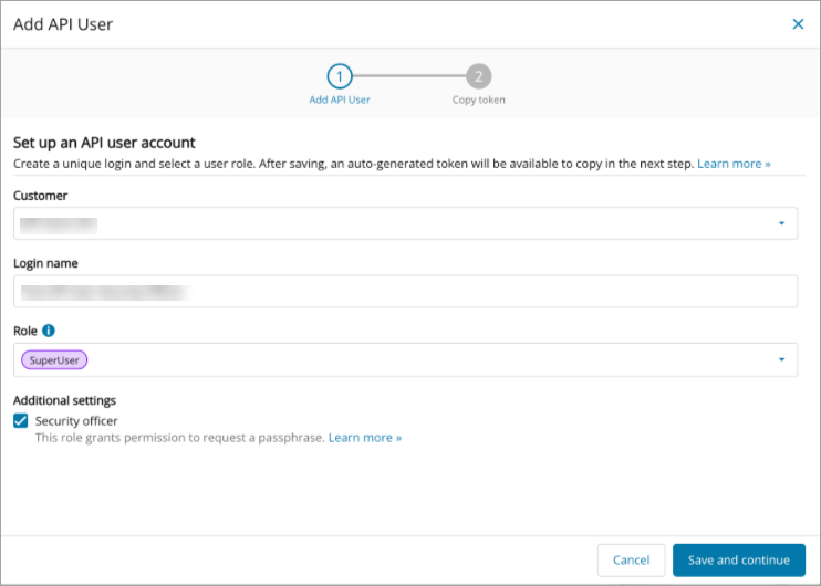 Click Add API user and enter the fields in Set up an API user account window