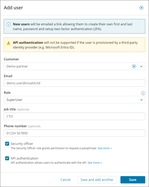 - Ensure that you check API Authentication if the user needs to be able to log in to the platform via an API call