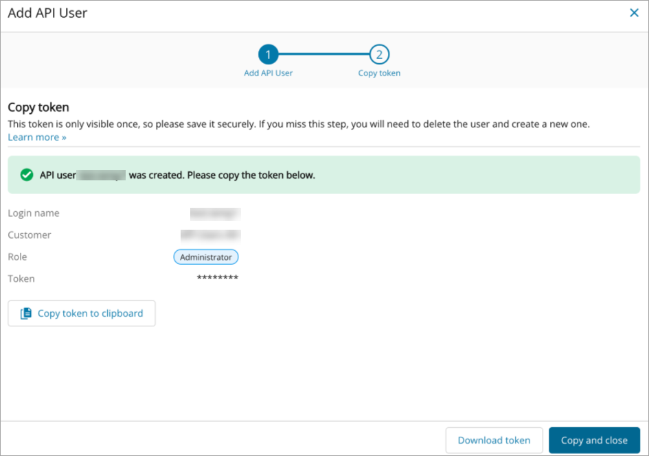Click Copy and close to add the API user
