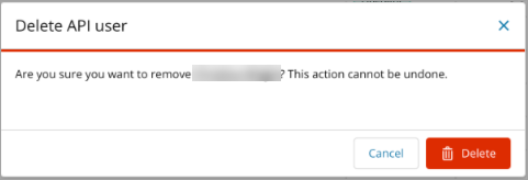 Click the three dots under Actions next to the name of the user that you want to delete. The Delete API user window displays.