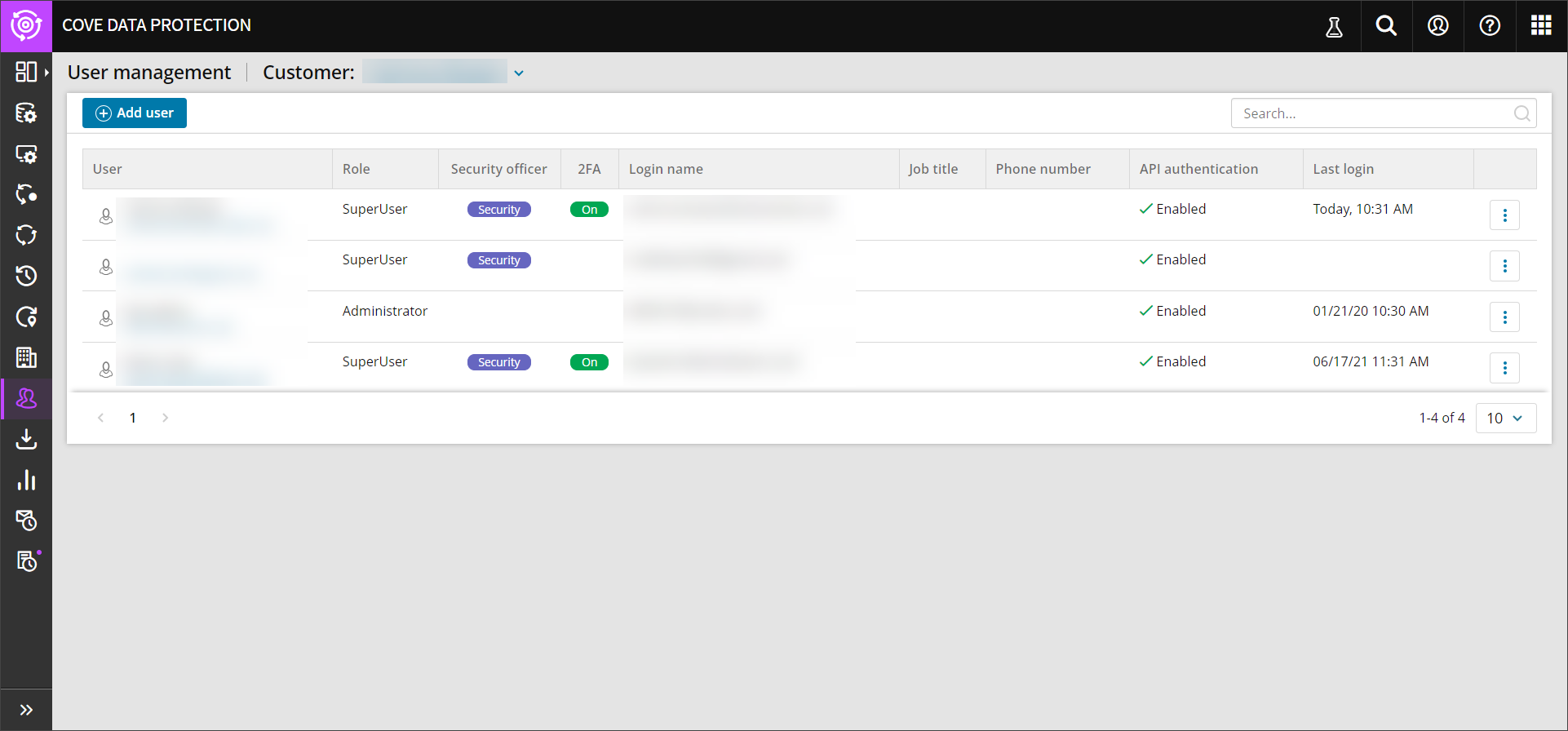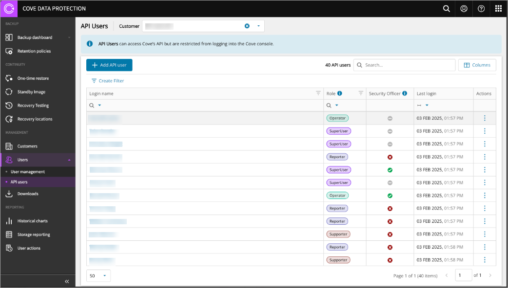 API users can access Cove's API but are restricted from logging into the Cove console.