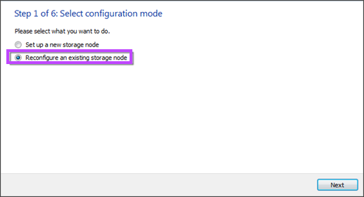 - On Windows, it opens as a set-up wizard. Choose Reconfigure an existing storage node