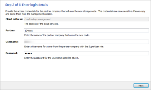 ./mxb-cloud-sn-linu x-x86_64.run Verifying archive integrity... All good. Uncompressing Cloud Storage Node installer........ Cloud storage node installation modes: [1] Setup new or update existing cloud storage node [2] Upgrade old appliance to a cloud storage node Enter the number: 1 Cloud partner name: AcmeIT Cloud user: root@email.com Cloud password for 'root' user: 123456 Attempting to authenticate at cloud.securebackupandrestore.com:443... ok Storage directory [/opt/mxb/storage]: Storage name [Primary]: linux_001 Storage node name: Linux001 ......