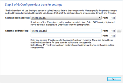 - Select the IP address you want to use for the storage node. You can enter the same IP address to the External address(es) field. If the external address differs from the primary storage node address, it should forward incoming traffic there (this is achieved with the help of a network adapter)