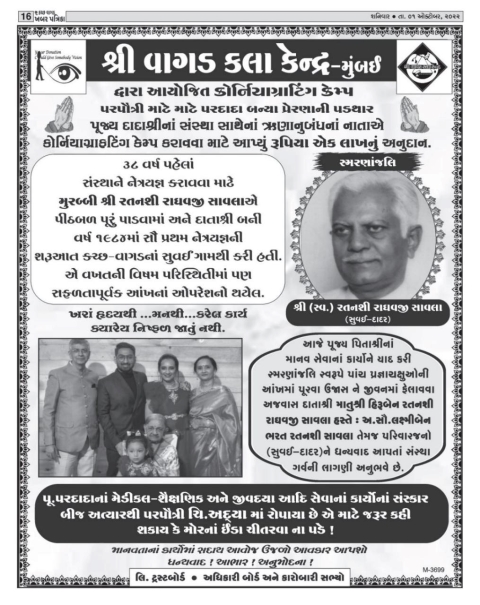 રતનશીભાઈ રાઘવજીભાઈ વિશાભાઈ સાવલા ની ૧૭મી વાર્ષિક પૂણ્યતિથી નિમિત્તે