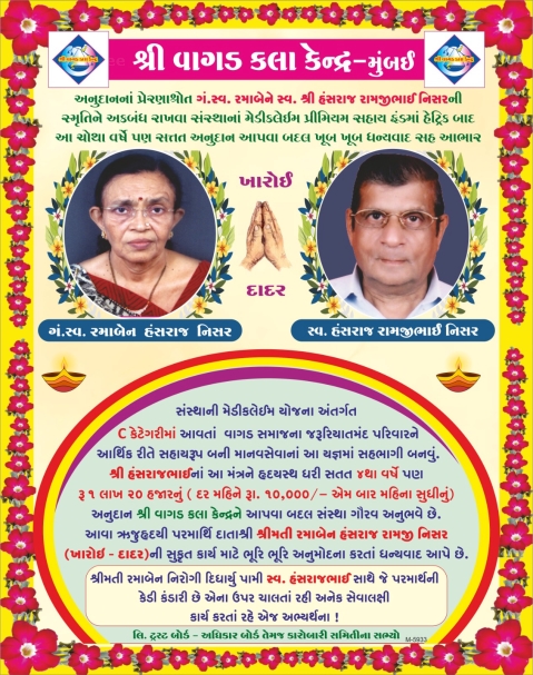 અનુદાનનાં પ્રેરણાશ્રોત ગં.સ્વ.રમાબેને સ્વ.શ્રી હંસરાજ રામજીભાઈ નિસર ની સ્મૃતિને અડબંધ રાખવા સંસ્થાનાં મેડિકલેઇમ પ્રીમિયમ સહાય ફંડ માં હેટ્રિક બાદ આ યોથા વર્ષે પણ સત્તત અનુદાન આપવા બદલ ખુબ ખુબ આભાર.