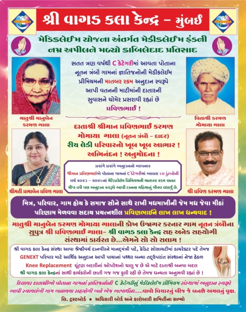 માતુશ્રી માનુબેન કરમણ મોમાયા ગાલા ની કોખ ઉજાગર કરનાર ગામ નૂતન ત્રંબૌના સુપુત્ર શ્રી પ્રવિણભાઈ ગાલા- શ્રી વાગડ કલા કેન્દ્ર સહ અનેક સહયોગી