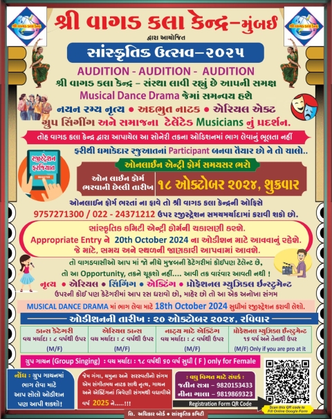 તો, શ્રી વાગડ કલા કેન્દ્ર દ્વારા અપાયેલ આ સોનેરી તકના ઓડિશનમાં ભાગ લેવાનું ભૂલતા નહીં.