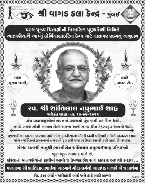ત્રિમાસિક પૂણ્યતિથી નિમિત્તે આત્મશ્રેયાર્થે આપ્યું કોર્નિયાગ્રાફટિંગ કેમ્પ માટે માતબર રકમનું અનુદાન