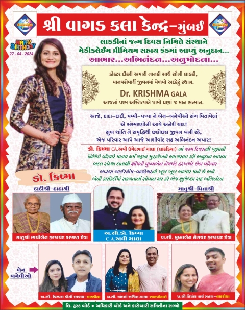 ડો. ક્રિષ્મા અવી ઉમેદ ગાલા (લાકડીયા - કાલબાદેવી)નાં જન્મ દિવસની ખુશાલી નિમિત્તે પરિવારે માનવ ધર્મ મહાન મુદ્રાલેખને આત્મસાત કરીઅનુદાન આપવા બદલ સંસ્થા દાતાશ્રી શ્રીમતી પુષ્પાબેન નેમચંદ હરખચંદ છેડા પરિવાર અપ્સરા આઈસ્ક્રીમ - વાલકેશ્વરનો ખૂબ ખૂબ આભાર માને છે અને ડો. ક્રિષ્મા એની કારકિર્દીમાં સફળતાનાં સોપાન સર કરે એ શુભેચ્છા સહ અભિનંદન.