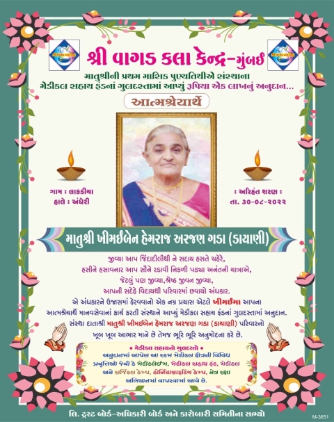 માતુશ્રી ખીમઈબેન હેમરાજ અરજણ ગડા (ડાયાણી)ની પ્રથમ માસિક પુણ્યતિથીએ સંસ્થાને આપ્યું મેડીકલ સહાય ફંડનાં ગુલદસ્તામાં રૂપિયા એક લાખનું અનુદાન સંસ્થા દાતાશ્રી પરિવારનો ખૂબ ખૂબ આભાર માને છે તેમજ ભૂરિ ભૂરિ અનુમોદના કરે છે.