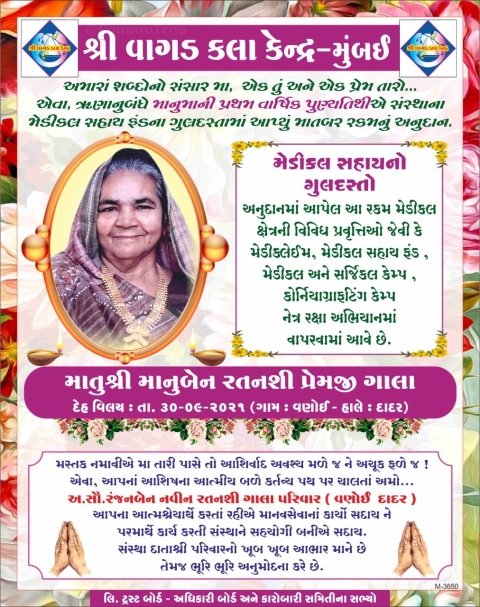 પરમ પૂજ્ય માતુશ્રી માનુબેન રતનશી પ્રેમજી ગાલાની પ્રથમ વાર્ષિક પૂણ્યતિથી નિમિત્તે અનુદાન