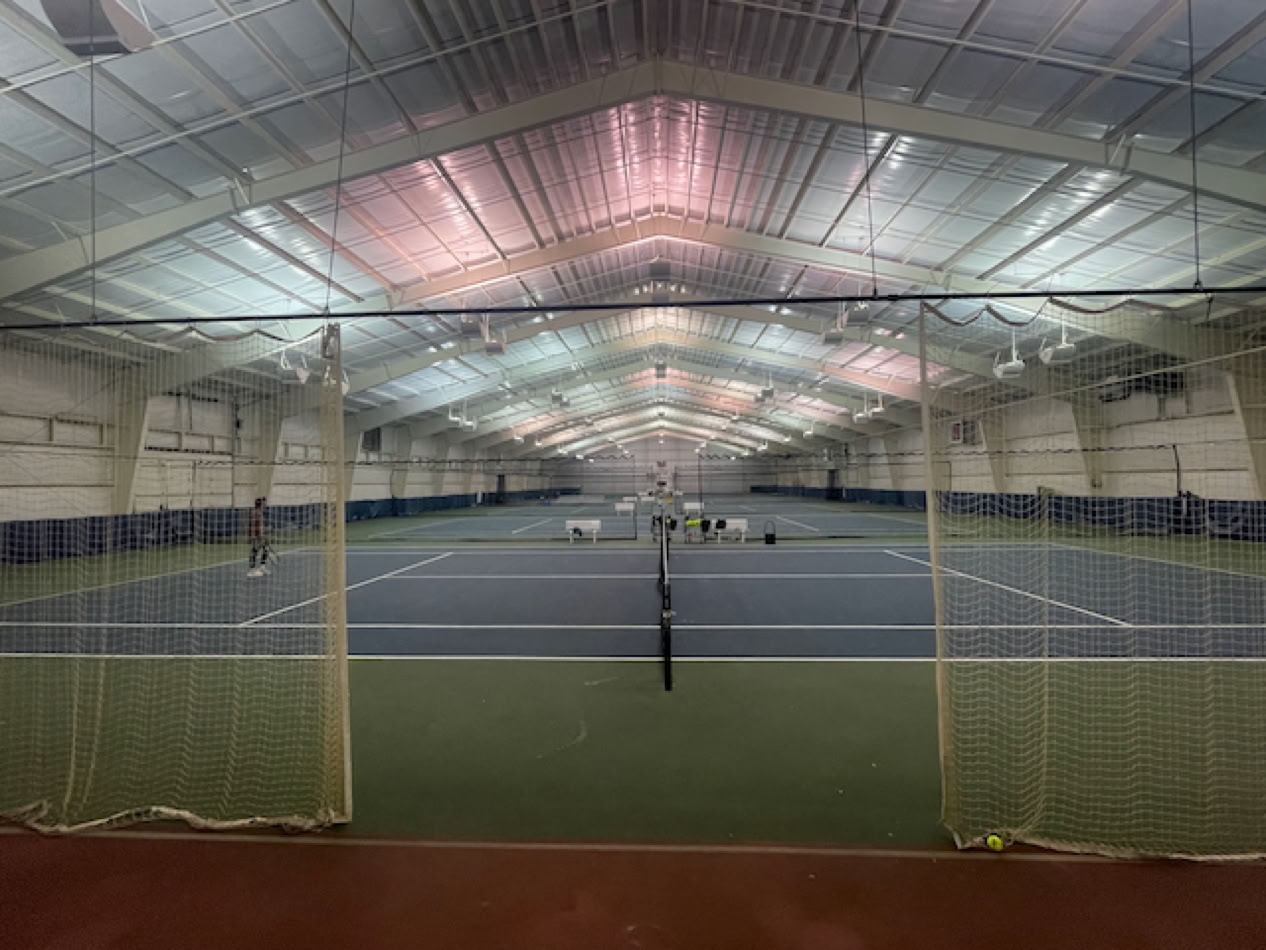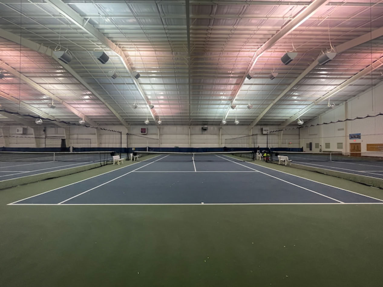 Nice indoor courts. Fast but not crazy fast. Good low contrast background that doesn't get in the way. A little dim lighting but you will quickly adjust. Can also be too warm in the late spring/summer. Fairly expensive court time costs for non-members.