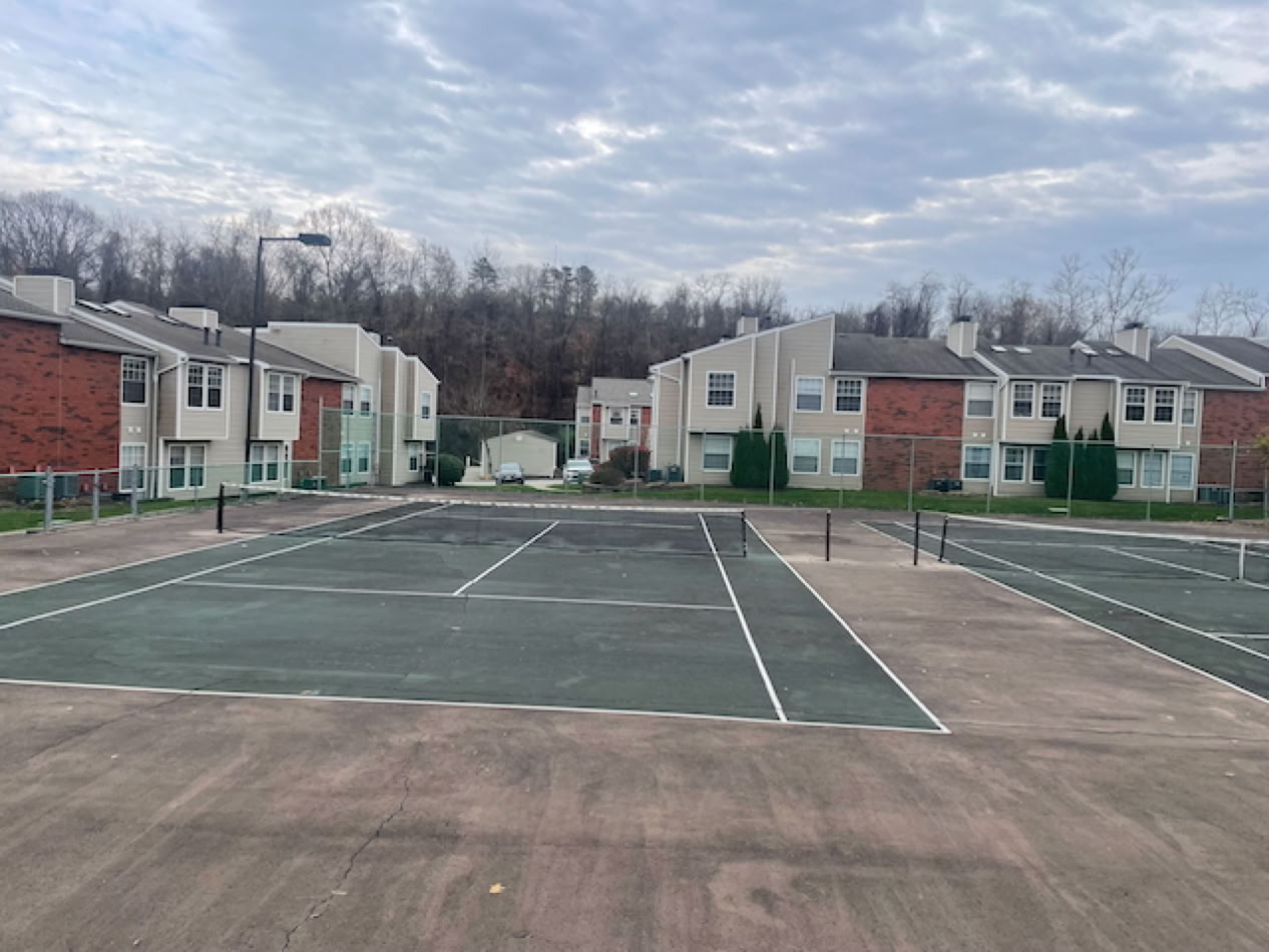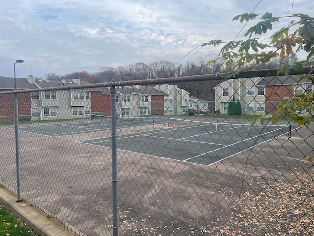 Another set of bad apartment tennis courts. Big cracks and bad nets. Residents seem to use it as a dog exercise park.