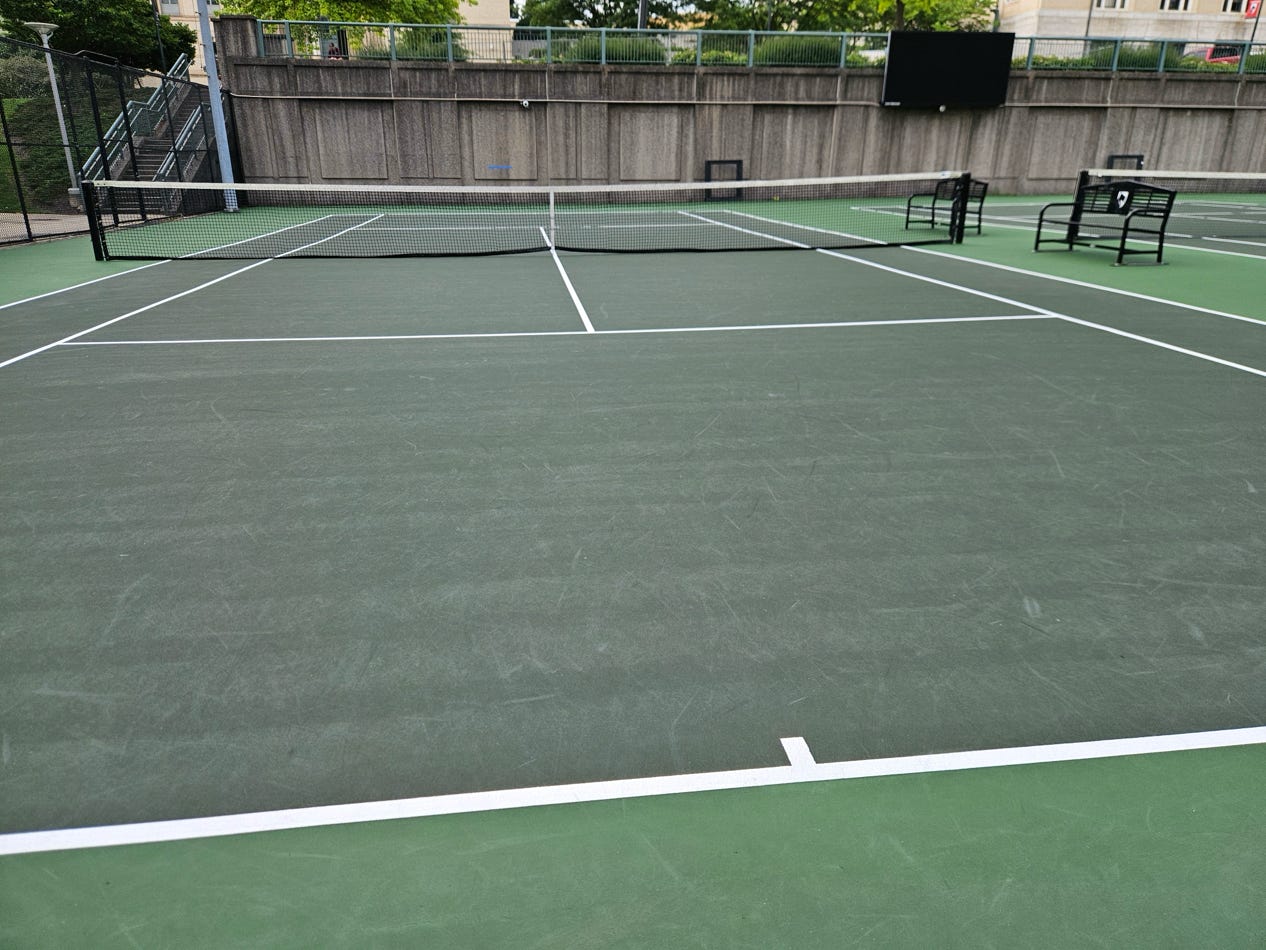 These courts were just redone summer 2024 so they are brand new. They have lights though they are of poor quality. They are not locked. CMU students can make reservations and kick you off. Generally available weekends in the summer. You have to pay for on-street parking on Margaret Morrison Street during the day and during weekday evenings.