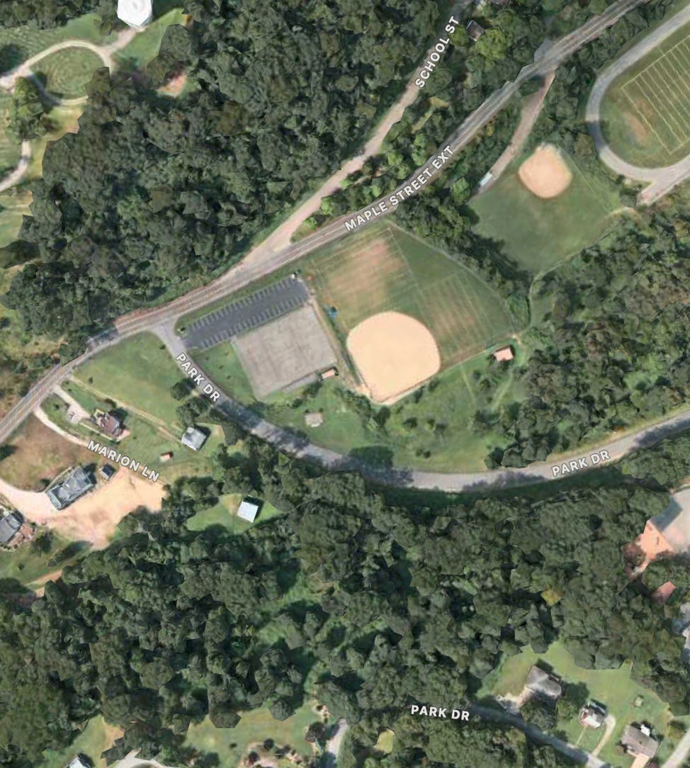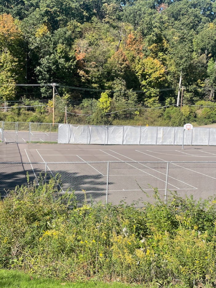 Added in for completeness sake. The Apple Maps photo is very out of date. The court has no paint on it now and also has no net and only has lines. Courts were located near where you turn in from the street, not by the school.
