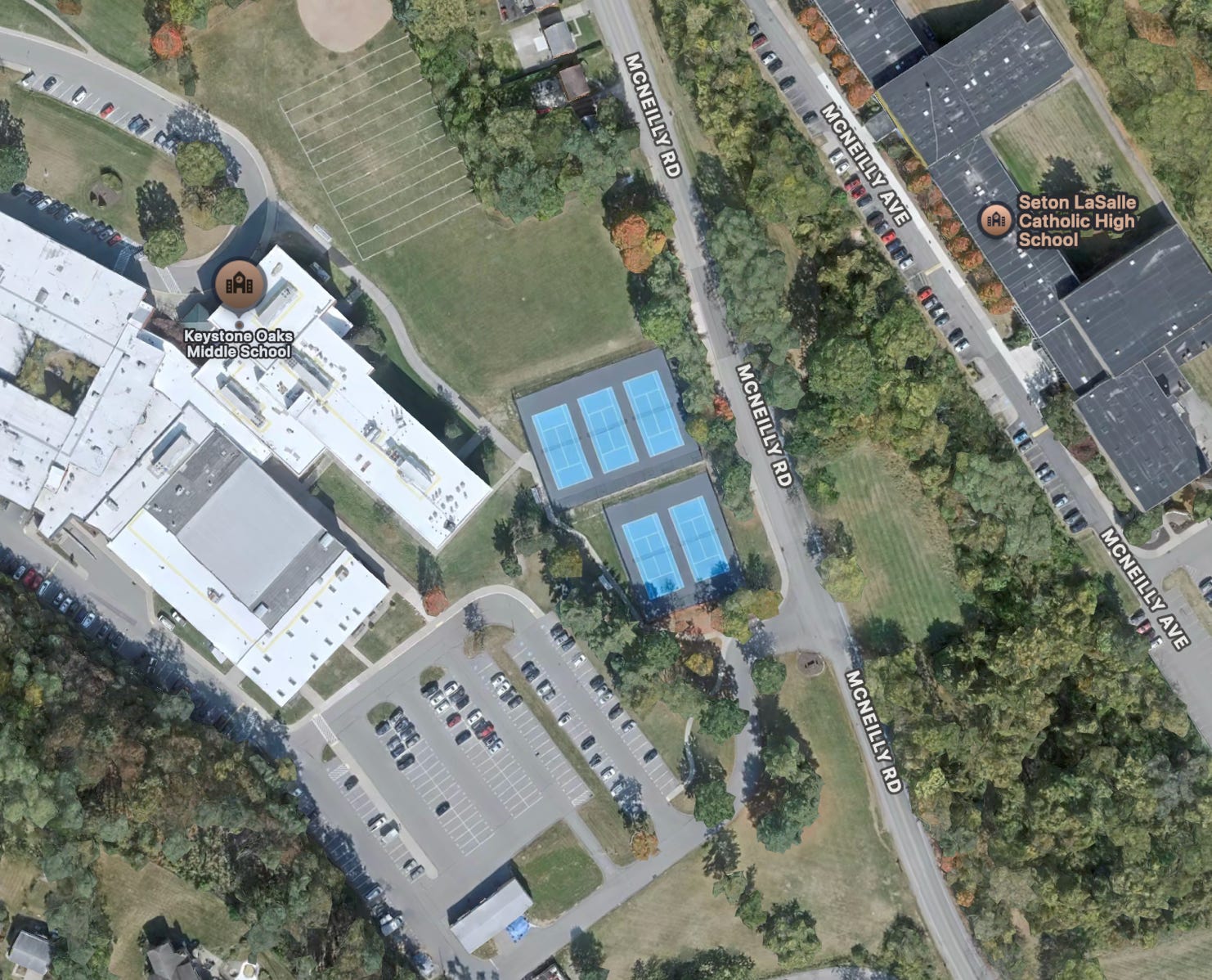 Great set of 5 courts in front of Keystone Oaks Middle School. These courts are locked all year round and reserved for school students only. Too bad as these look pretty good.