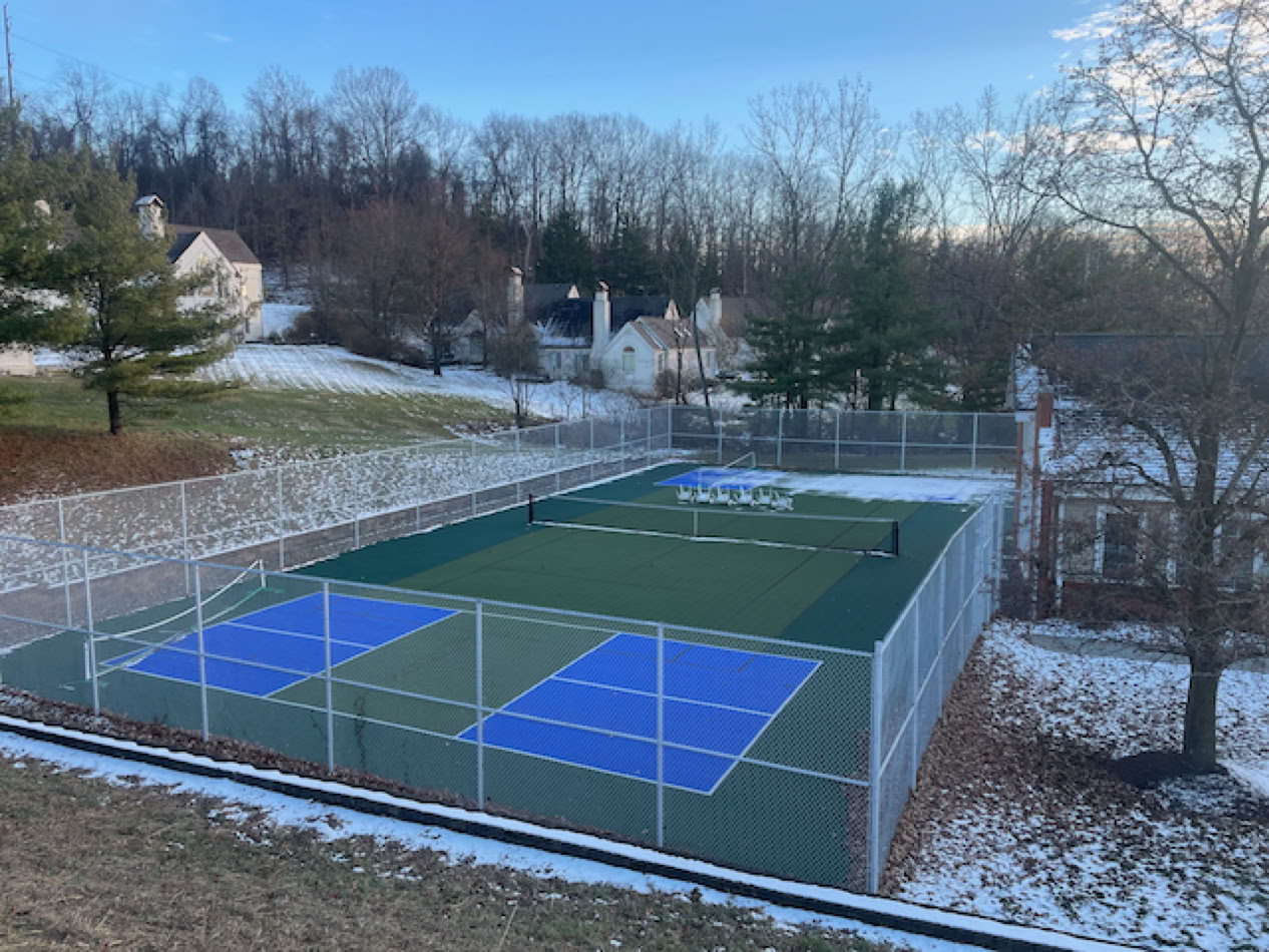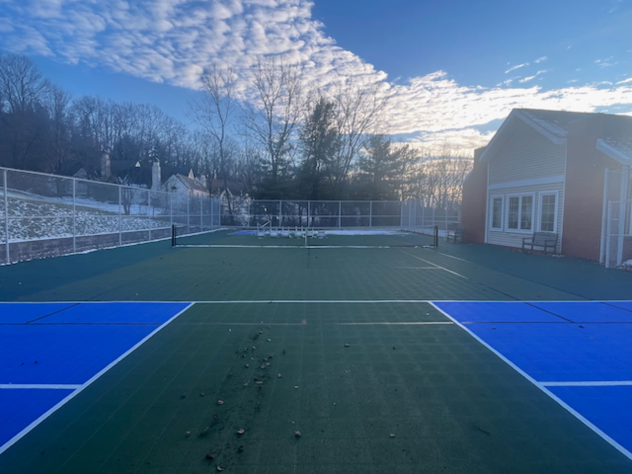 I think this was a tennis court at one time in this retirement community but it's a pile of plastic now. There are two removable pickleball nets and some chairs which would need to be removed to use these courts.