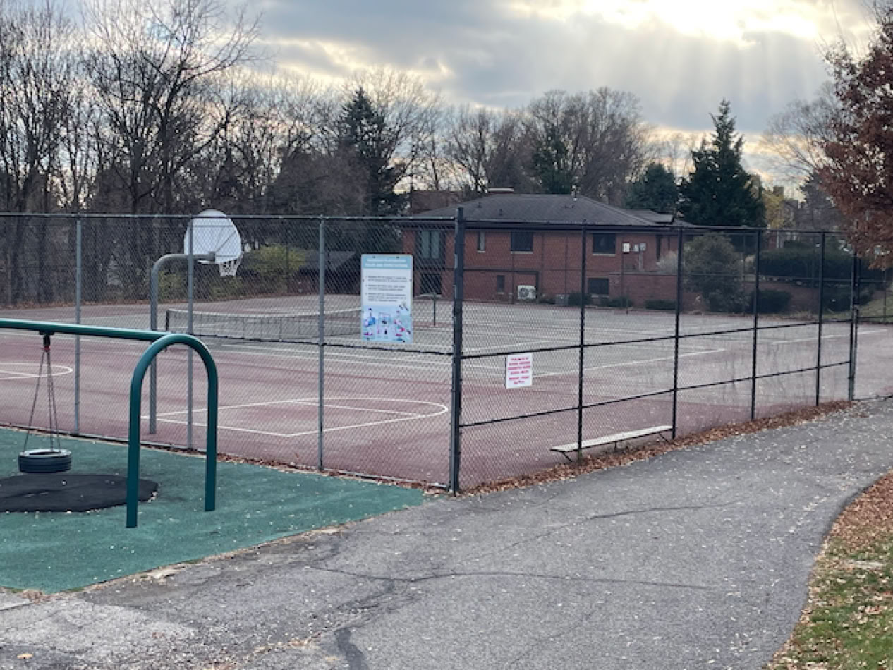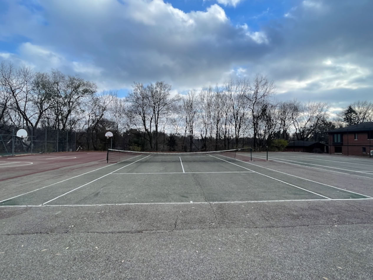 This is one pair of crapulous tennis courts for sure. It is not really part of the school, I believe, so there should be no hours restrictions if you really want to play here for some unknown reason. Might be ok for a beginner lesson.