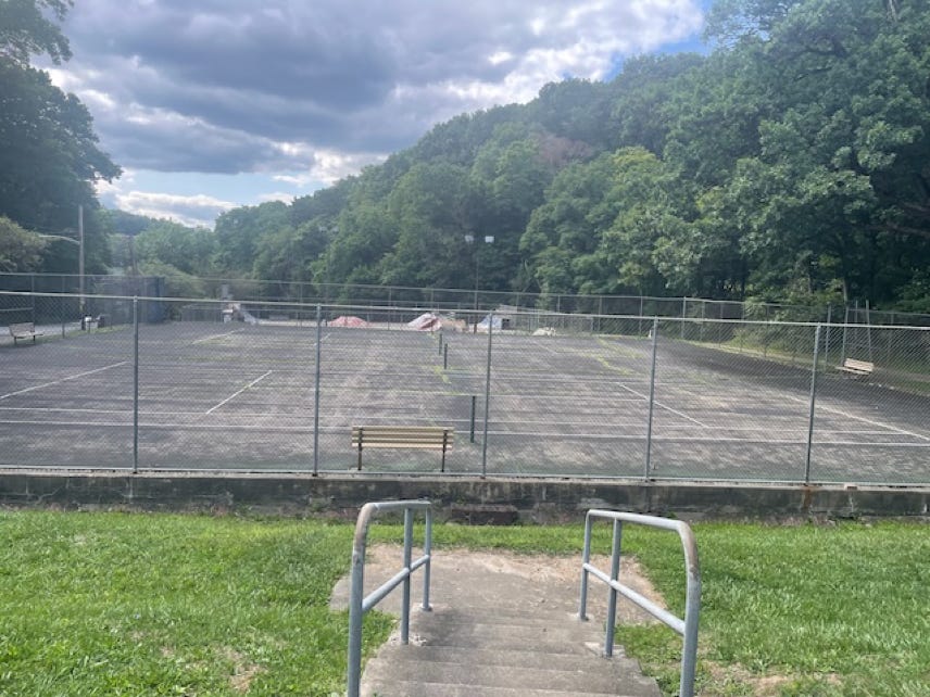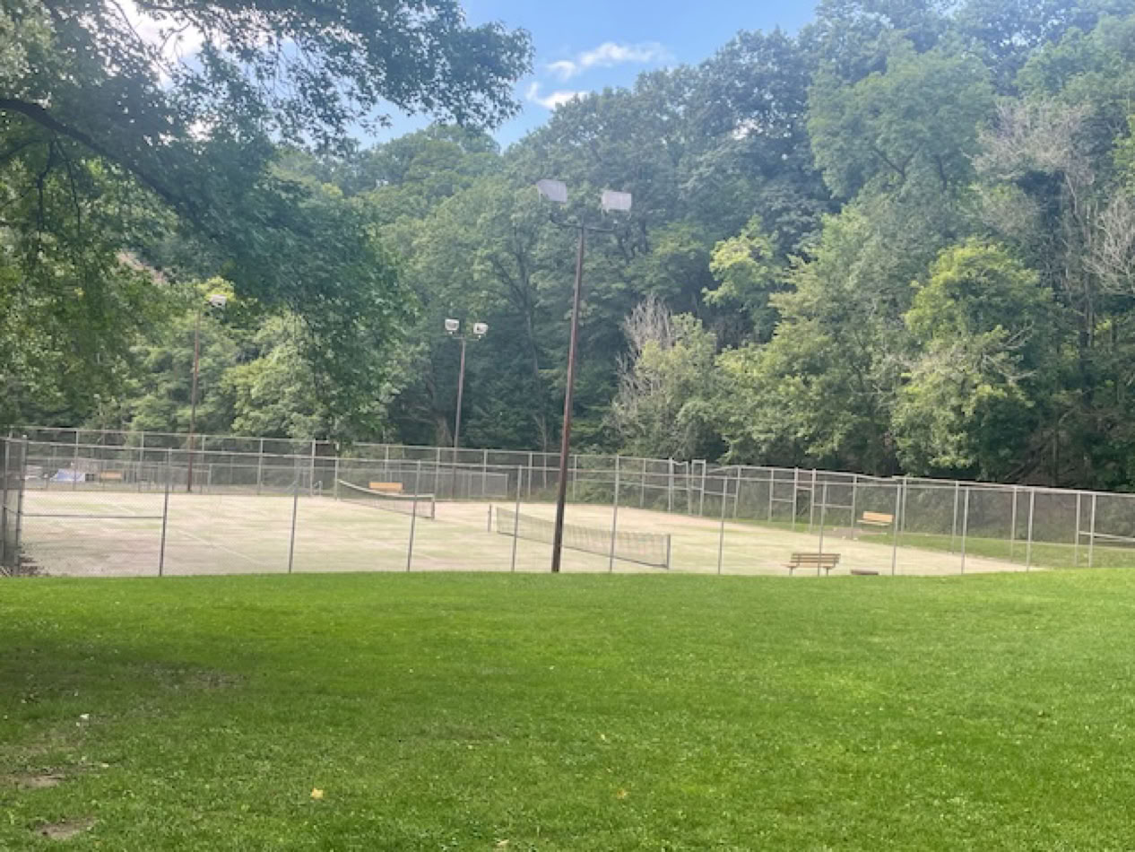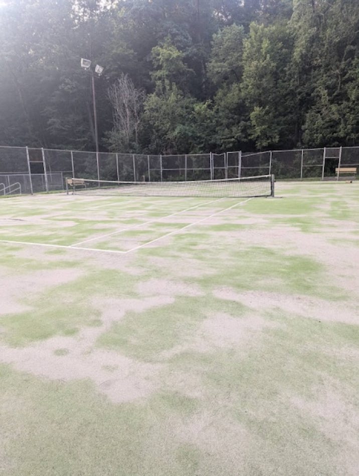 These courts have a very unique astroturf over sand surface. They dry very quickly after a rain and kind of sort of play like grass. There seems to be four existing courts but only two are usable.
