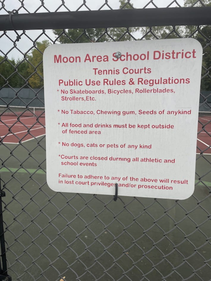 Courts are part of a large multi-school campus so you might have to noodle around a little to find them. These were redone a few years ago but are back to looking meh. Because this is a school, access is limited during school hours. PS… check out the sign at the bottom of the page. You can’t make this stuff up.