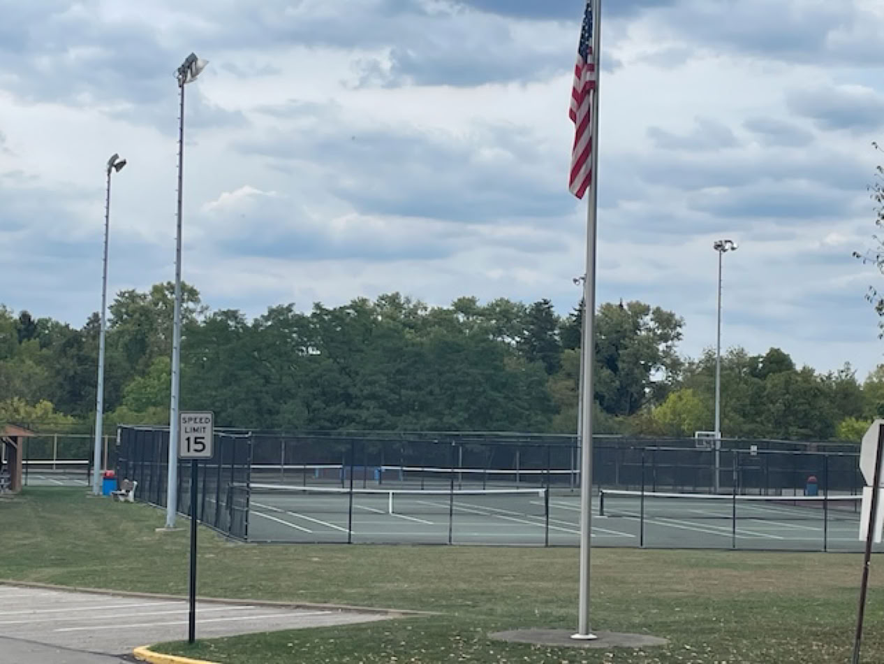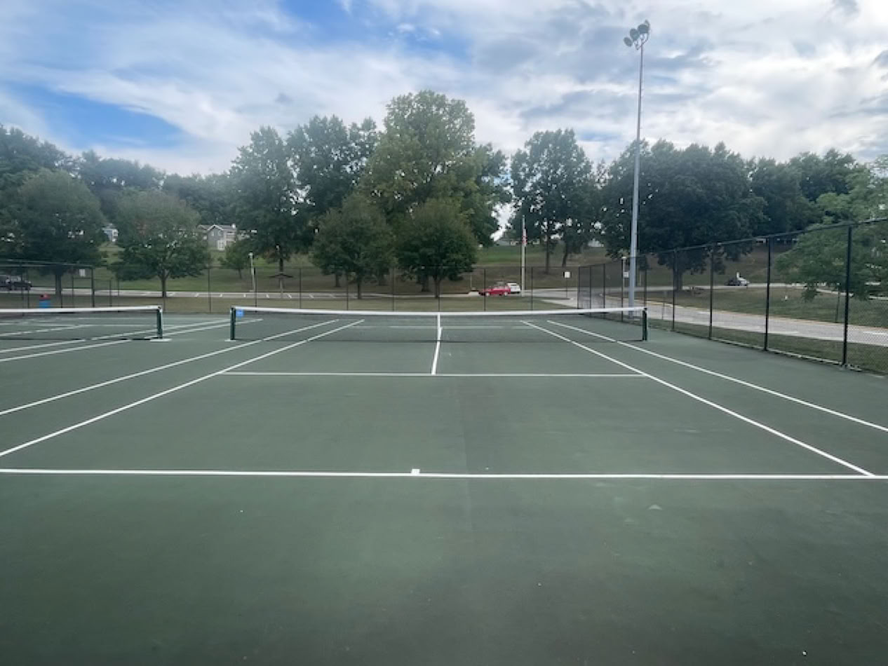 These courts were redone in 2019 but have deteriorated rapidly. There are lights but they don't work very well. However, the park itself is nice and has amenities. When the pool is open, there is a snack bar which is available.