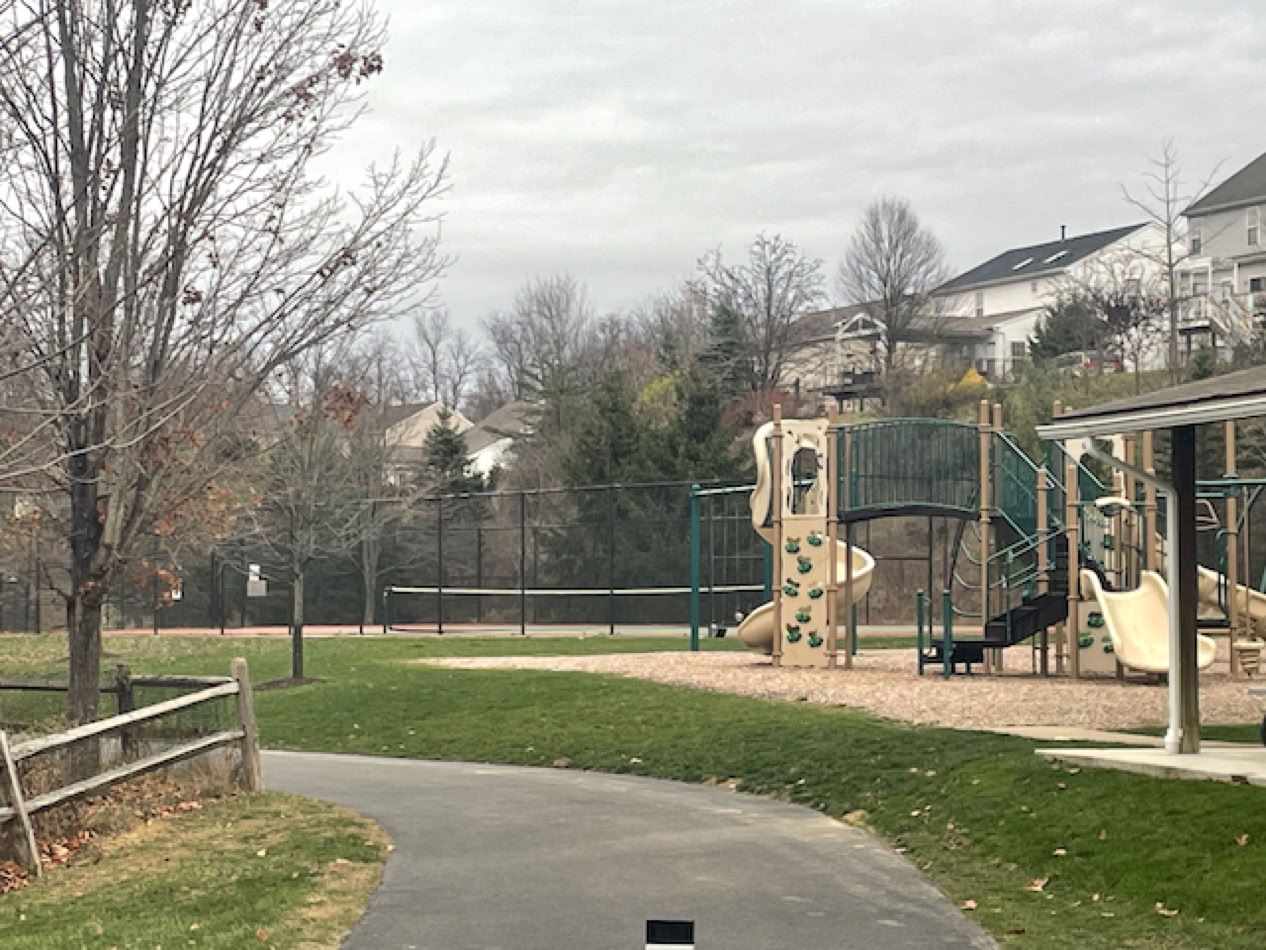 Surprising discovery of a single court. Supposedly these are private but they are not locked and hardly used so if they were used for tennis, there would be no problem. Also the housing is pretty low density so they are pretty isolated. The courts are a short way down a walking path that leads away from the parking lot.