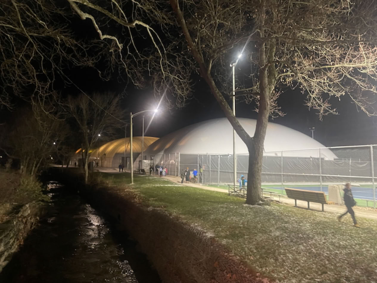 Price is very reasonable but spot time availability is spotty. This Apple Maps picture is from summer and the six courts circled in red are enclosed in temporary winter bubbles.
